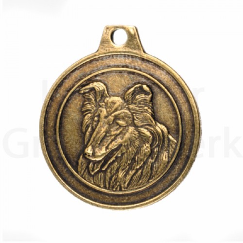 Schotse Collie bronzen rashondenpenning, geleverd met messing sleutelring. Deze penning is 25 mm diameter. Voor maximaal 3 regels tekst.